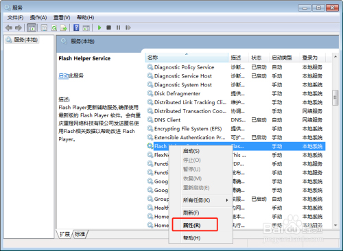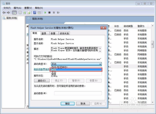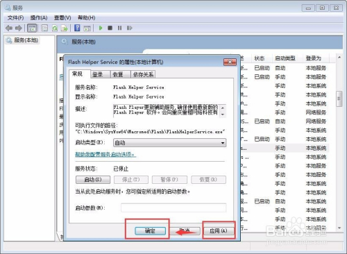 点中“Flash Helper Service”,鼠标右击,选择属性,在常规页面下,把启动类型改为“自动”,然后点击“应用”、“确定”
