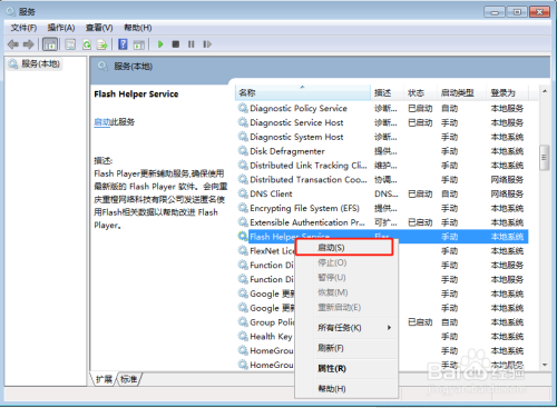 选中“Flash Helper Service”鼠标右击“启动”,启动完成后问题就解决啦。